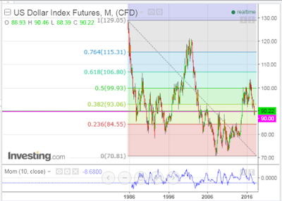 The monthly chart of the US Dollar Index shows that price is attempting to stabilize around the 90.00 level, as it closed just above on Friday. It's currently in between major support (84.55) and resistance (93.06) levels, as set by the 23.6% and 38.2% levels of a very long-term Fibonacci retracement.