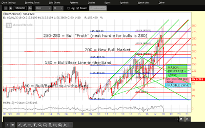 As long as the SPX:VIX ratio remains, firstly, below 150, and, then, below 200, volatility will remain elevated as shown on the monthly SPX:VIX ratio chart below. Historically, price on the SPX consists of wild, aimless/trendless and very volatile swings when this ratio remains below 150.