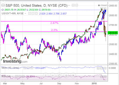 The following daily comparison chart shows that 10-YR rates have held near their recent highs during the recent correction of the SPX. Whether rates continue to hold or push higher on any recovery in equities, and whether that may materially impact the extent of such a recovery, remains to be seen. As long as 10-YRT remains above, firstly, 2.67% and, ultimately, 2.5%, then equities will remain vulnerable to more wild swings and weakness.