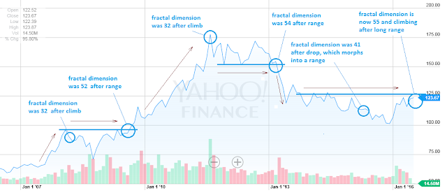 The fractal dimension is low after an extended, powerful move, and builds to a high after a protracted sideways move or range. It exhausted to a low of 32 after the big climb into the 2008 top and built to a high of 52 just before the blitz up to the 2011 top. After a range at this top, a dimension of 54 was built, which exhausted itself quickly with the 2013 move.