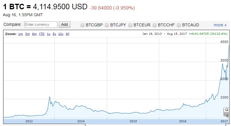 When blockchain is used for Bitcoin, the blockchain records the ownership of each bitcoin, and when each bitcoin is transferred to another user. But the users themselves remain (although sufficiently motivated law enforcement can sometimes find a way in). Bitcoin has been in the news lately because it has been experiencing a price spike. Here's the price of bitcoin in US dollars from Google Finance website. As you can see, the price of a bitcoin first soared above $1,000 back in 2013, sagged, slowly moved back to about $1,000, but then in the last few months has soared to above $4,000.