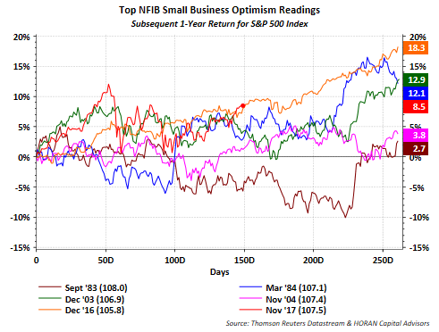 Four out of last seven highest NFIB readings have occurred in the last eighteen months. As the below chart shows, historically, 1-year subsequent returns for the S&P 500 Index have generally been strong following high levels of small business optimism. Going forward I will include tracking of the equity market's performance based on this new high reading as well.