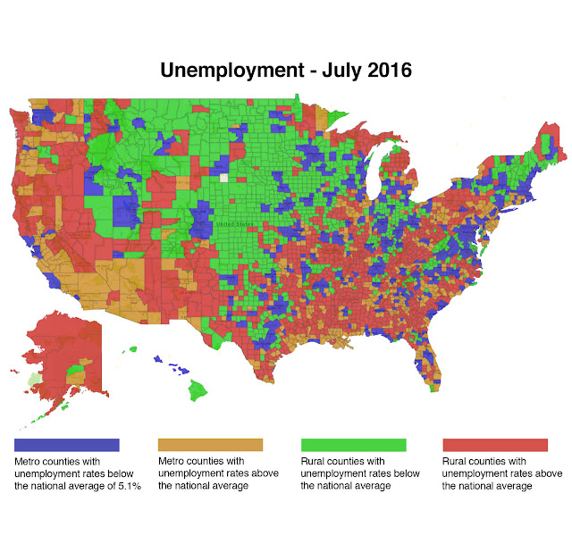 And of course, that is the problem with much of rural America, the main industry is irreplaceable. As we see in the screenshot of a Google Map, above average unemployment has engulfed the rural South. And in Pennsylvania, and Michigan we see just a few areas that traditionally go Democratic but have lost rural employment at above average rates. Hillary's people should have taken a good hard look at this unemployment map!