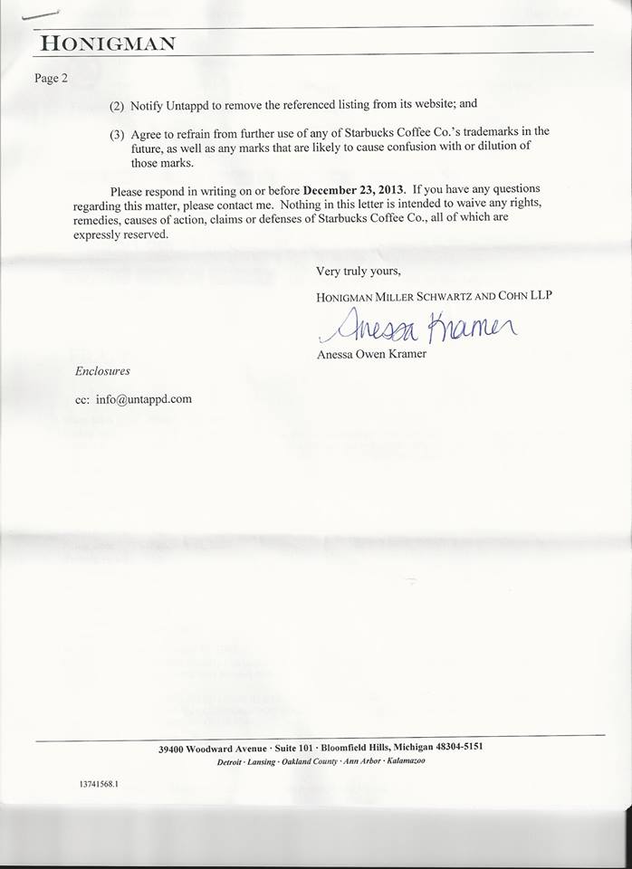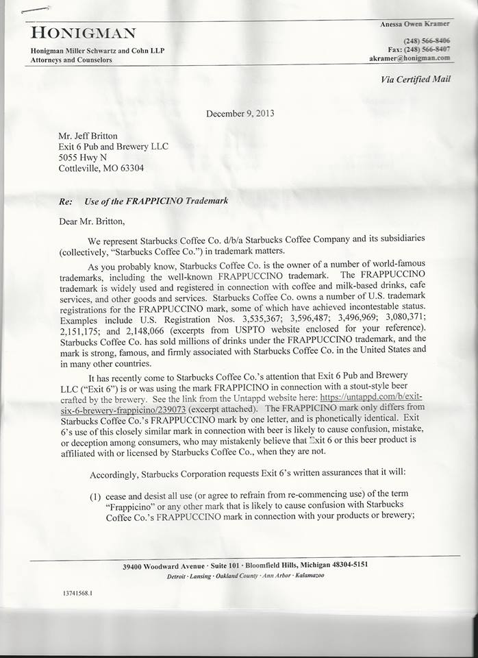 "So quick little story. Last week I received a cease and desist letter from the attorneys at Starbucks. Apparently there was a beer on Untappd that someone named "Frappicino". 3 people had checked into said beer. 3. Starbucks didn't like that. ...So I got a letter. They wanted me to remove the beer and promise never to use their names again. They also wanted my written response and guarantee. Here is their letter. And also my response."