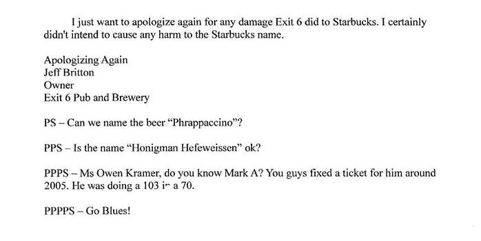 Most small business owners would have cowered or panicked had they received a cease and desist letter from a Starbucks attorney. But not Jeff Britton. Mr. Britton, owner of Exit 6 Pub and Brewery, turned the tables on Starbucks with this ingeniously funny letter... and a check for $6. Copies of which he posted to his facebook page along with the following story: