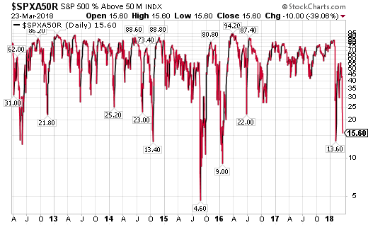 On a short term basis the indices appear to be oversold. One measure to evaluate is the percentage of stocks trading above their 50 and 200 day moving averages. The first chart shows only 15% of S&P 500 stocks are trading above their 50 day moving average. The chart shows that this measure can get reach the single digits, but mid to low teens is one indication of a short term oversold market.
