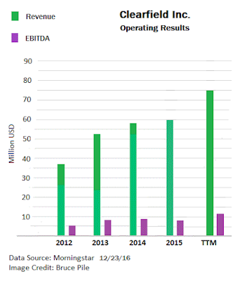 Clearfield's selling point is that they are the least painful way to get the limitless bandwidth and "future proof" nature of light waves sent to your screen. Clearfield has the kind of insider ownership I like. With CLFD, you actually have more insider ownership (18%) than mutual fund ownership (11%) and almost as much as institutional ownership (23%). It is somewhat undiscovered, except by the insiders. Despite all the cycling fiber has done, this company has produced steady, strong growth over the years: