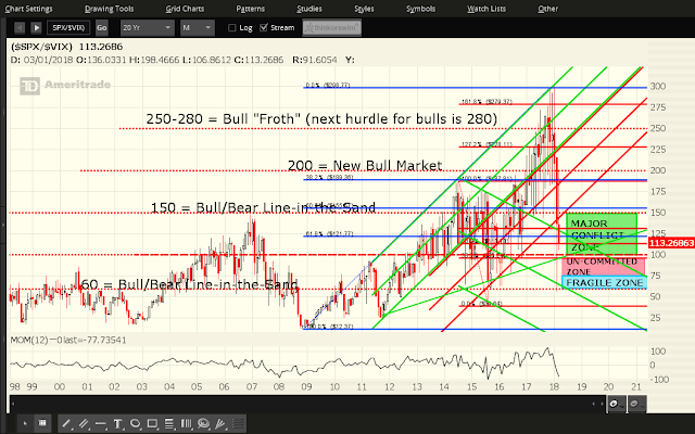After today's broad-based equity drop, the SPX:VIX ratio has extended its decline, closing well below the 150 Bull/Bear line-in-the-sand level, and is mired in the "major conflict zone," as shown on the monthly ratio chart below. Momentum is accelerating to the downside and is well below its zero level.