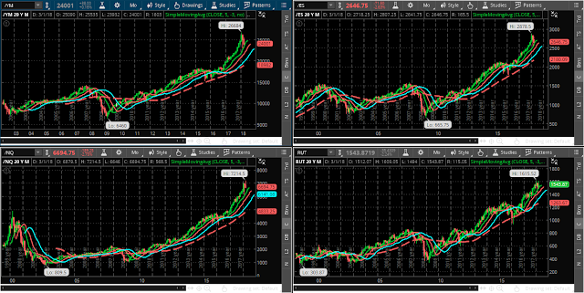 Finally, the following monthly charts of the Dow 30, S&P 500 & Nasdaq 100 E-mini Futures Indicesplus the Russell 2000 Index show that price is hovering above a moving average "Alligator" formation. If price falls inside this formation, we'll see high volatility and wild swings remain, with, possibly a further correction in equities, until it breaks out and holds above this beast. Unless we see a very sharp snap-back soon in these indices (in the next week or two), I'd say that higher volatility will continue for awhile.