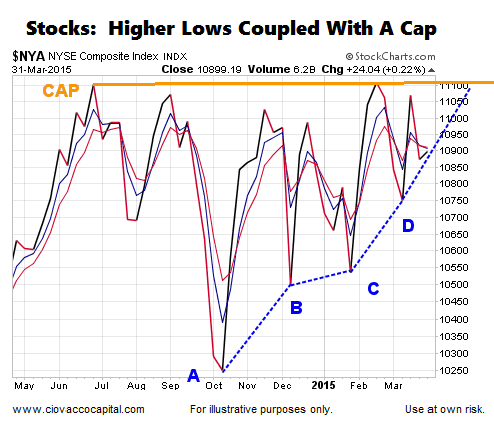 Points A, B, C, and D in the chart below show a series of higher lows. The higher lows tell us that buying conviction has exceeded selling conviction at higher and higher levels in recent months. Another way to visualize the formation of the triangle is that dip buyers have been less and less patient since the October 2014 low. The higher lows are the good news for the bulls. The bad news is that based on numerous concerns, including earnings and the Fed, buying conviction has not been strong enough to exceed the “cap” (see orange line below).