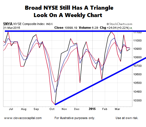 With respect to earnings, the easy thing for investors to do is to extrapolate the recent bearish trend several months down the road. While earnings reports may meet bearish expectations, it is also possible that future guidance comes in above low expectations. Is there any support for the “things could turn out better than expected” scenario? Yes, one example comes from the easy to understand triangle formation shown on the weekly chart of the NYSE Composite Stock Index below.