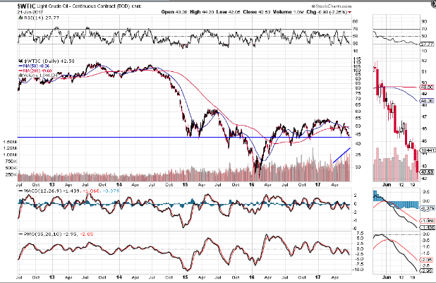 Price today (Wednesday) fell below 43.50, which I identified in my post of June 3rd as a major support level, and closed at 42.53, as shown on the Daily chart below.