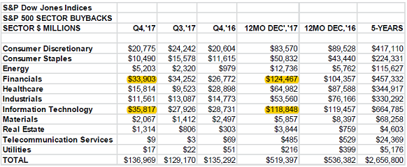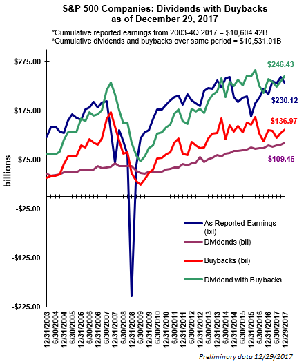 - for the calendar year of 2017, dividends plus buybacks equal $939.17 billion versus $933.60 billion for 2016. Howard Silverblatt, Senior Index Analyst for S&P Dow Jones Indices, commented in the press release that the buybacks and dividend combination could exceed the $1 trillion level this year. Driving the potential increase in buybacks and dividends this year is the reduced corporate tax rate along with the repatriation of cash trapped overseas.