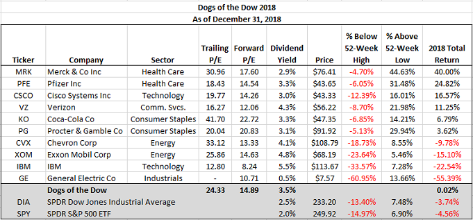 With the 2018 investing year now closed, one strategy that turned out to be a winning one was the Dogs of the Dow strategy. The Dogs of the Dow strategy is one where investors select the ten stocks that have the highest dividend yield from the stocks in the Dow Jones Industrial Average Index (DJI) after the close of business on the last trading day of the year. Once the ten stocks are determined, an investor invests an equal dollar amount in each of the ten stocks and holds them for the entire next year. The popularity of the strategy is its singular focus on dividend yield.
