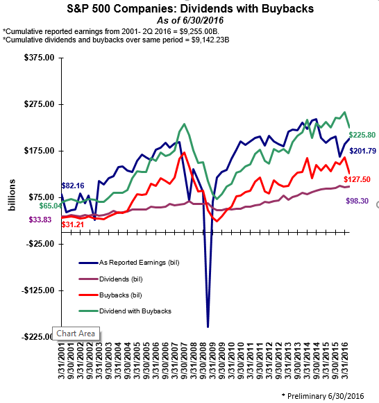 - "The rate of dividend increases continues to slow across sector lines, as income investors remain limited in their alternatives. Base buyback expenditures, those used to negate stock options, may need to increase in Q3 2016 to compensate for higher share prices. Discretionary buybacks, used to reduce share count and increase EPS, remain the main unknown.”