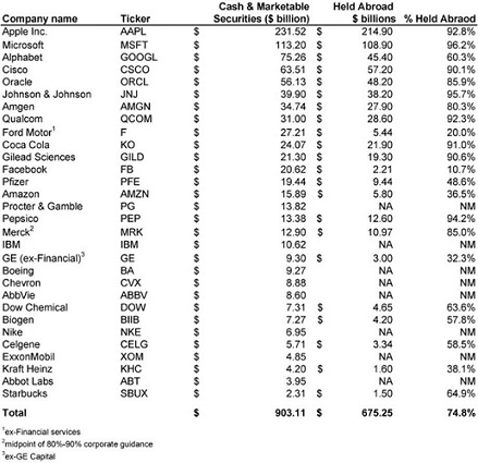 On the campaign trail Trump indicated he desires to reform the tax code with a result of lowering the overall tax rate. One of his proposals is to reduce the tax on companies with cash trapped overseas. Below is a table outlining those companies with large cash holdings held abroad. Repatriated cash could be spent domestically, on higher dividends and stock buybacks.