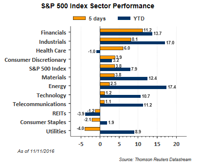 This post is more of a chartfest to feature information I ran across over the weekend from various sources but related to investment topics relevant to potential policy changes under a President-Elect Trump administration. Investors know the equity market reacted favorably to the election outcome last week; however, some market segments did far better than others. Although the night is long, the futures market tonight is indicating a positive open for Monday. The Dow and S&P futures are higher by about .40% to .50% (this is 95 points on the Dow).