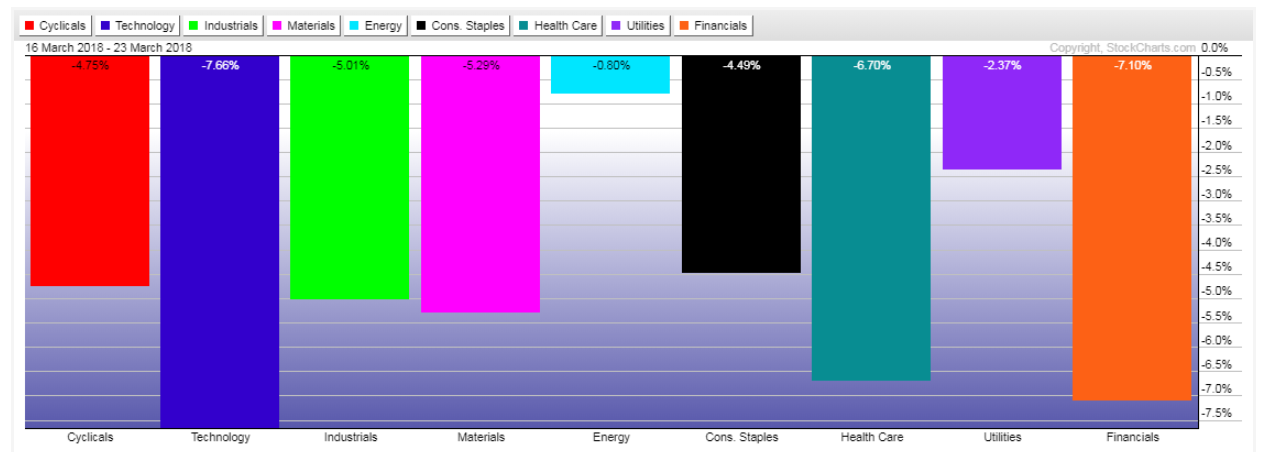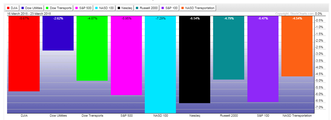 The large-scale selloff hit all of the Major Indices and Major Sectors this past week, as shown on the following one week graphs.