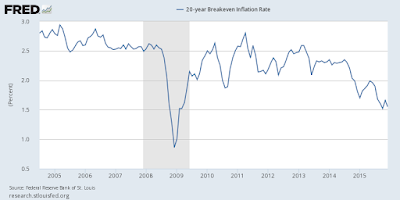 You can see by the next graph that the inflation rate (breakeven used here), was humming along and had not dropped in early 2008, while NGDP had already been dropping. Therefore, the Fed, if it were only looking at inflation, did not see any threat to money supply that was really occurring. Again, was it a mistake or done on purpose? Only the Fed knows that.