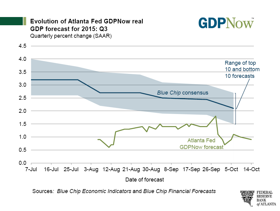 Following today's retail and business sales reports, the Atlanta Fed GDPNow Forecast for third quarter GDP slipped 0.1 percentage points to 0.9%.