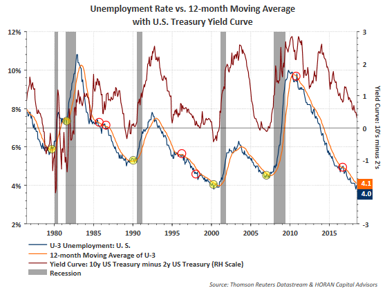 The increase in the unemployment rate to 4.0% moves the rate close to the 12-month moving average of the same rate, i.e., 4.1%. It is not uncommon for the sidelined unemployed to be pulled back into looking for a job when the labor market gets tight and the economy nears the end of its economic cycle. I am not saying the end of the expansion is around the corner; however, companies tend to operate at a high level late in the economic cycle with employment demand high. Additionally, if the unemployment trend moves the rate above its 12-month moving average on a sustained basis, this could have negative economic implications, i.e., job seekers finding it difficult to secure a job.
