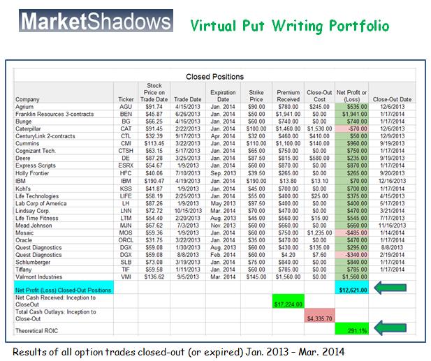It has been a bit over fourteen months since Market Shadows started our Virtual Put Writing Portfolio. Readers who tagged along with our easy to follow option trades have been big winners.