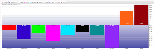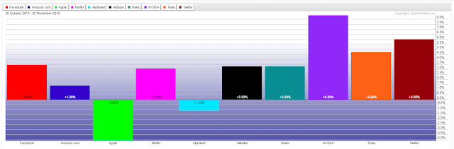 The following one week percentages gained/lost graph of the FNGU stocks show that NVDA, TWTR and TSLA have gained the most, while AAPL lost the most in this timeframe.