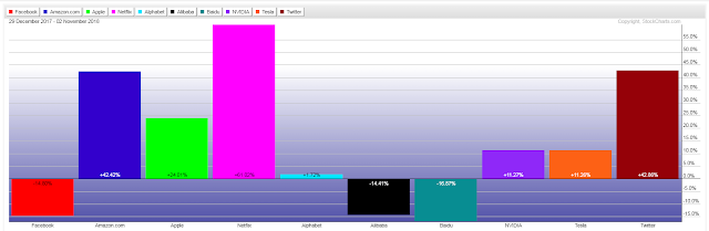 The following year-to-date percentages gained/lost graph of the FNGU stocks show that NFLX, TWTR and AMZN are still up the most, while BIDU, FB and BABA have lost the most in this timeframe.