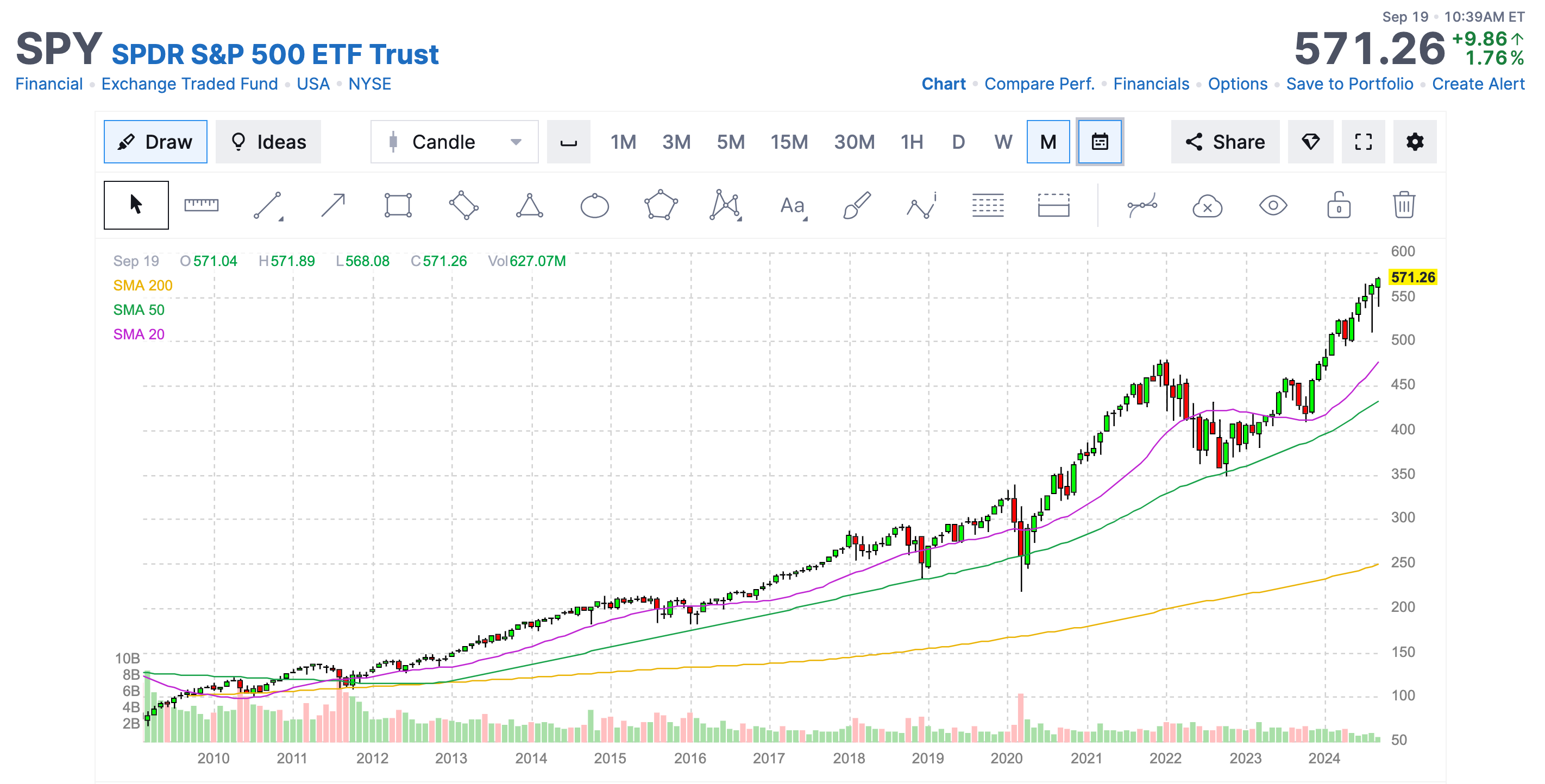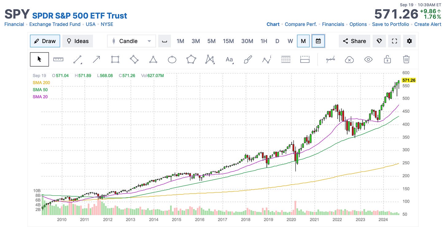 But here’s the S&P 500 ETF (SPY) since early March 2009, when the Fed started pumping capital into the financial system.