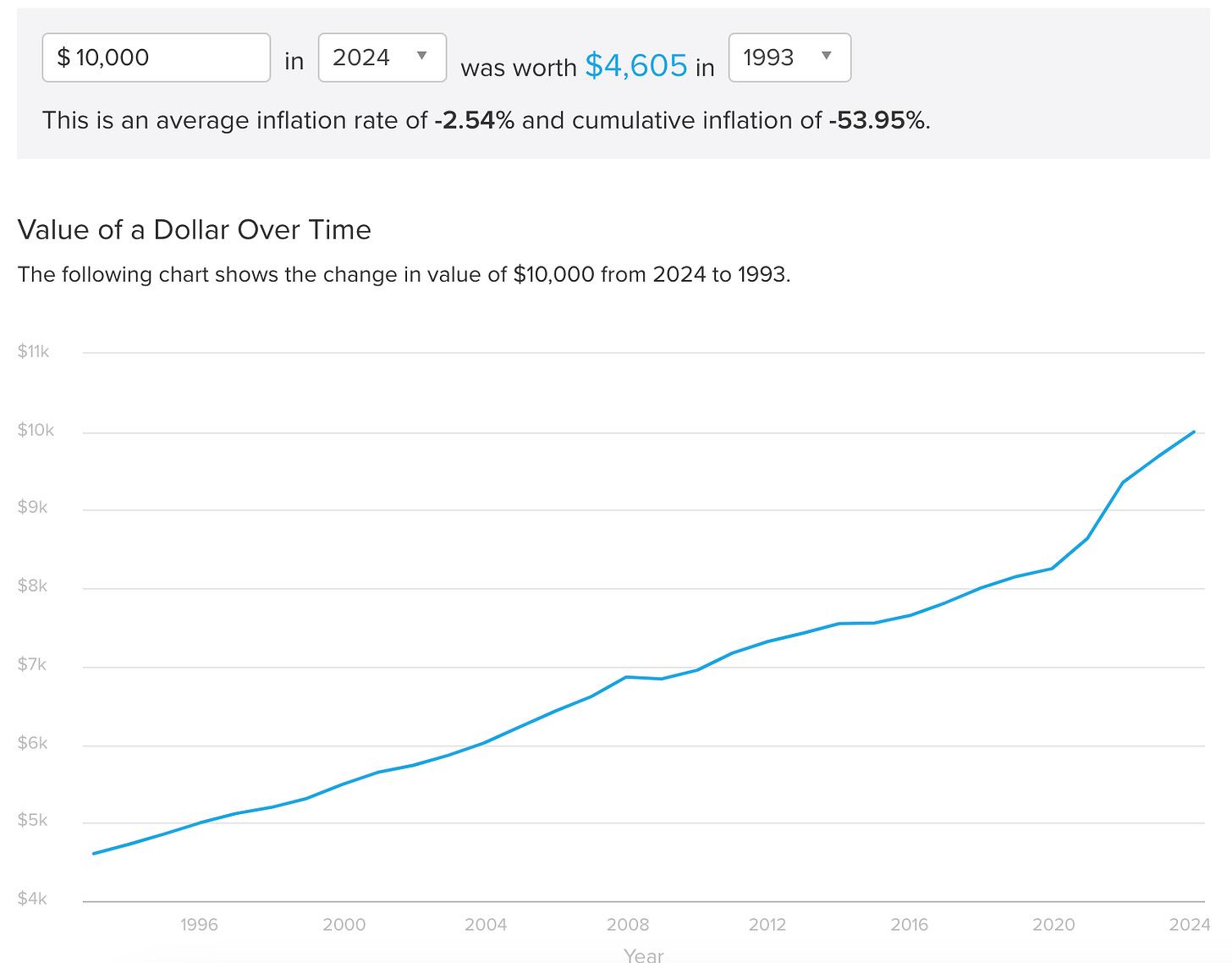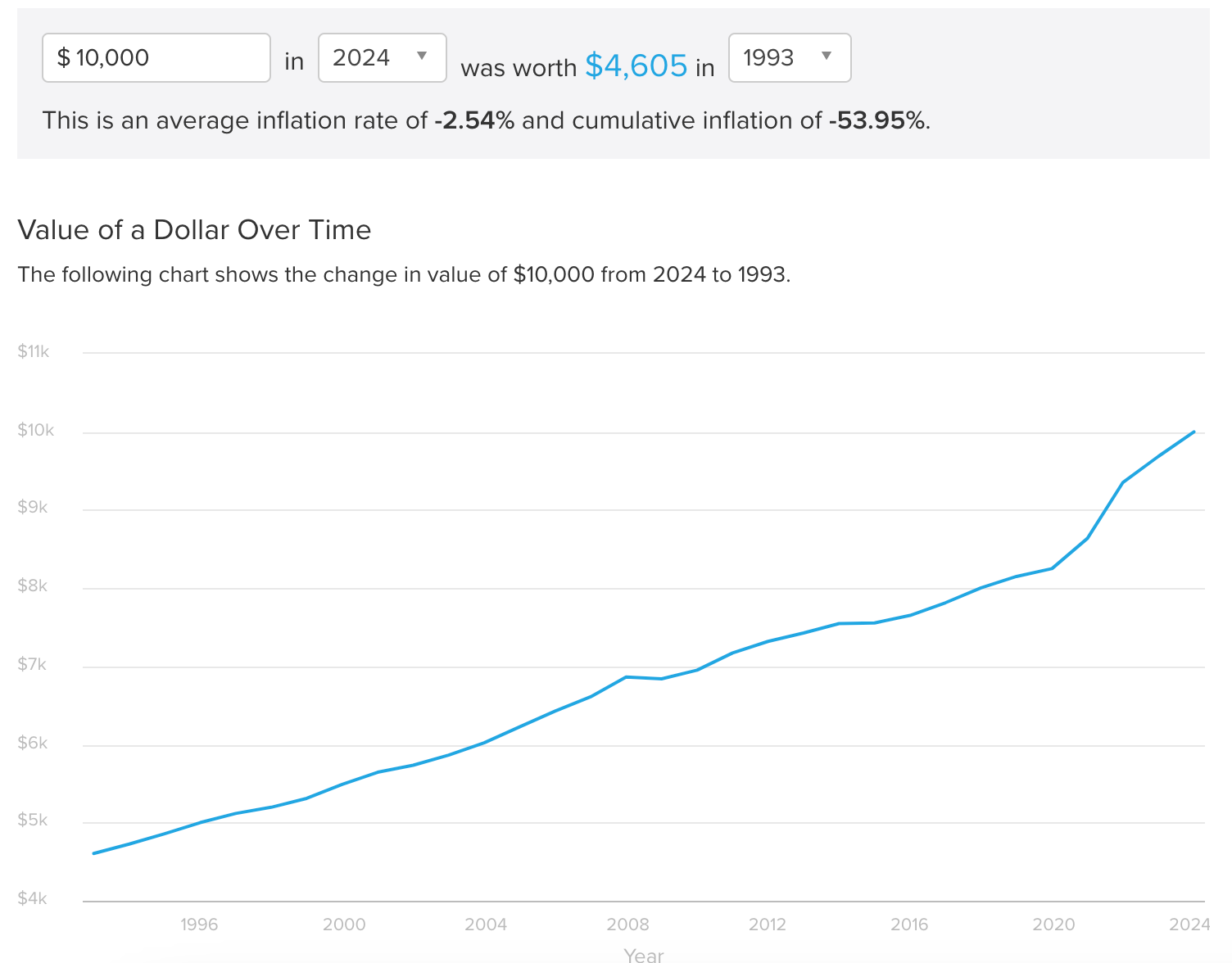 It's even worse if you look back to 1993 when the central bank began its inflation targeting. The dollar's purchasing power has been down 54% since 1993, while the S&P 500 has been up more than 1,166% in those 31 years.