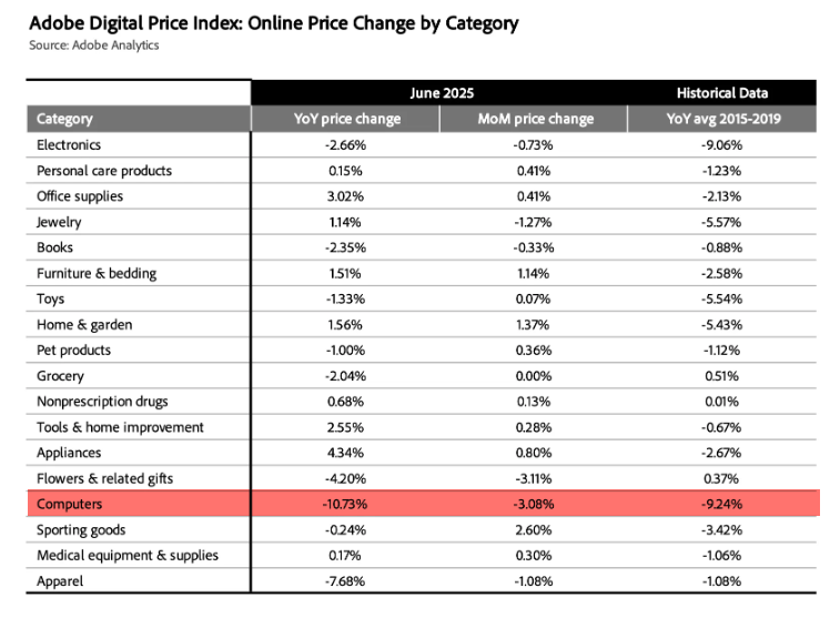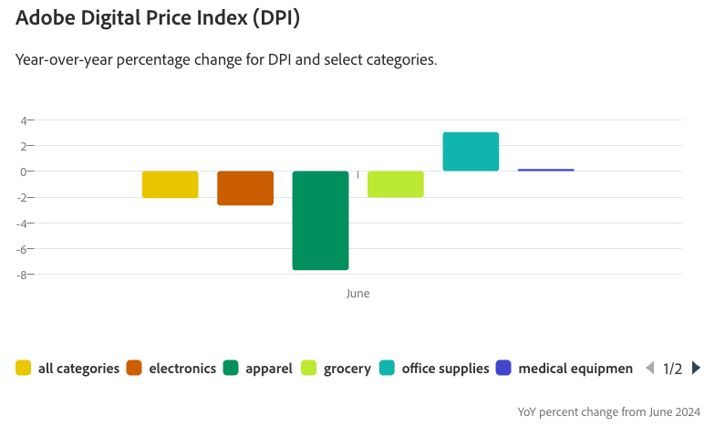 The Adobe Digital Price Index—an Adobe Analytics–powered inflation gauge that tracks online prices, similar to the CPI but focused on digital commerce—printed at -2.09% year-over-year in June. Categories such as apparel (-7.68%), electronics (-2.66% YoY), and groceries (-2.04% YoY) all experienced deflation.