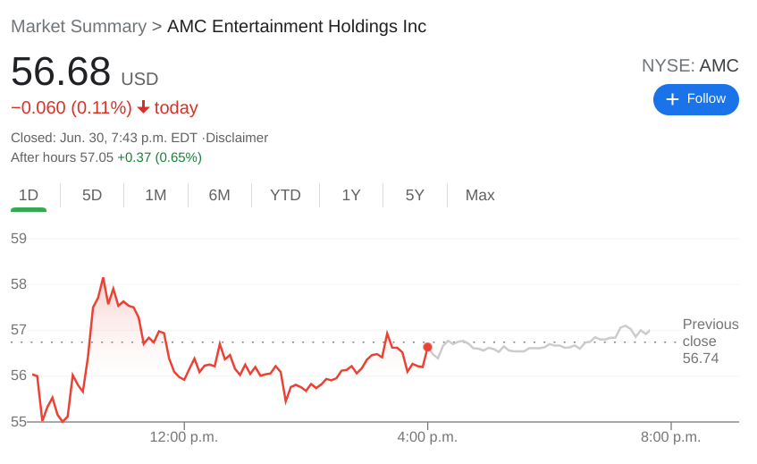 NYSE:AMC has been quiet as of late, and surprisingly the stock has maintained its overinflated valuation despite the momentum of the short squeeze dying down. On Wednesday, shares of AMC trimmed 0.11% to close the trading session at $56.68, during a relatively choppy yet uneventful session for the broader markets. GameStop (NYSE:GME) gained 1.62% and BlackBerry (NYSE:BB) trimmed off 0.20%, as the meme stocks had a flat day on much lower than average trading volume, another sign that the latest meme short squeeze could be fading.