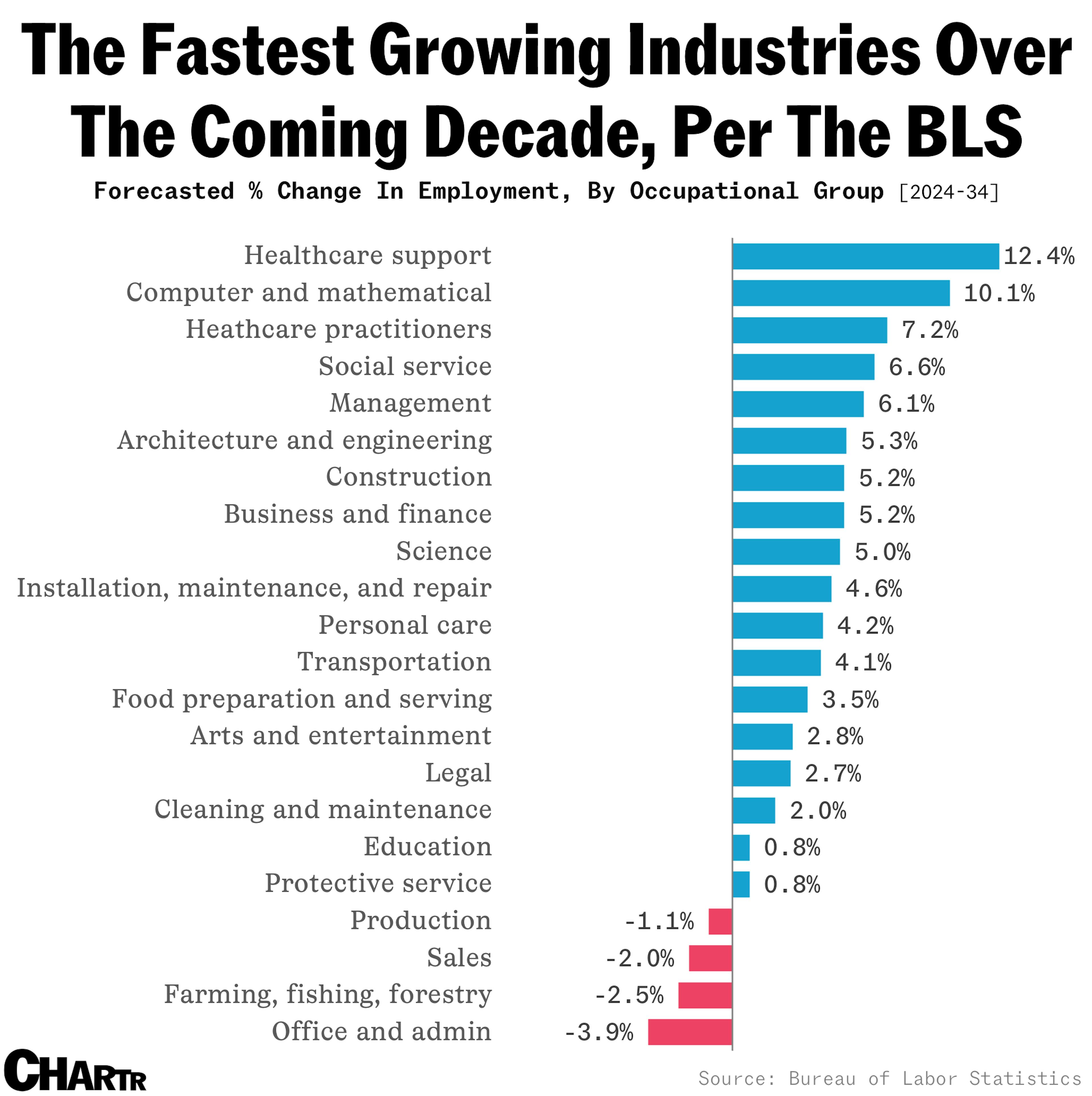 The changes to the job market ahead will be partly driven by AI displacement (particularly with the diminishment in office jobs). If you like changing bedpans, though, the world is your oyster!