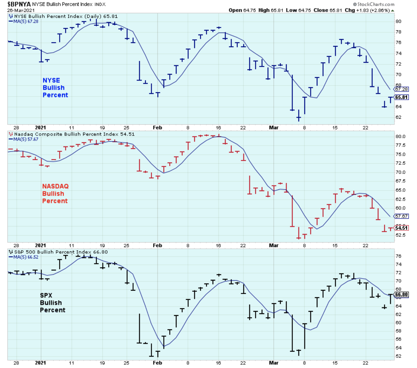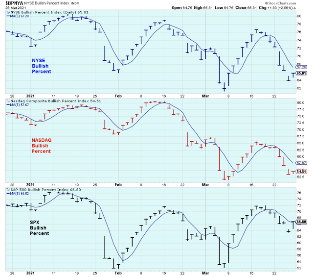 The PMO indicator for the broader market index has started to turn higher, and from a level that is higher than the previous PMO low. That is generally a good sign but let's see this PMO exceed the high marked by the red arrow. If the PMO can't exceed this level then we need to be prepared for the possibility that it won't find significant support until it reaches the November low.