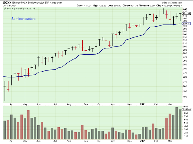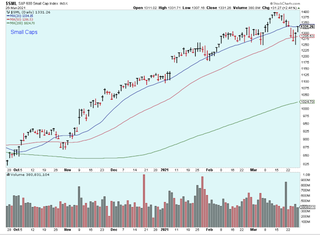 Small caps have been important leaders since last November, so they were due for some choppiness after a run like this. I like the looks of this chart because the index tested the 50-day and the early March low, then reversed bullishly. We could have had better volume, though. Keep an eye on these small caps to see how the index handles resistance at the 20-day and then the prior highs. The best outcome would be to see it get above the 20-day and stay there for a bit before breaking into new highs. On the other hand, the worst outcome would be a close below Thursday's low which would probably be a signal to move back to cash.