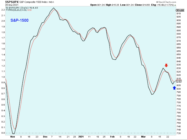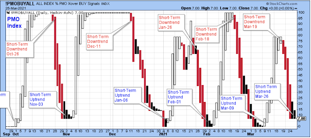 A short-term uptrend started on Friday, March 26. Not all the indicators agree that the trend is higher, and, as a result, we need to be prepared for the possibility of a whipsaw bad-signal. For instance, the PMO index below doesn't show a white candle yet which means that the uptrend is not confirmed. But the charts below show some very bullish-looking patterns, so, in the short-term, the trend is higher.