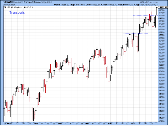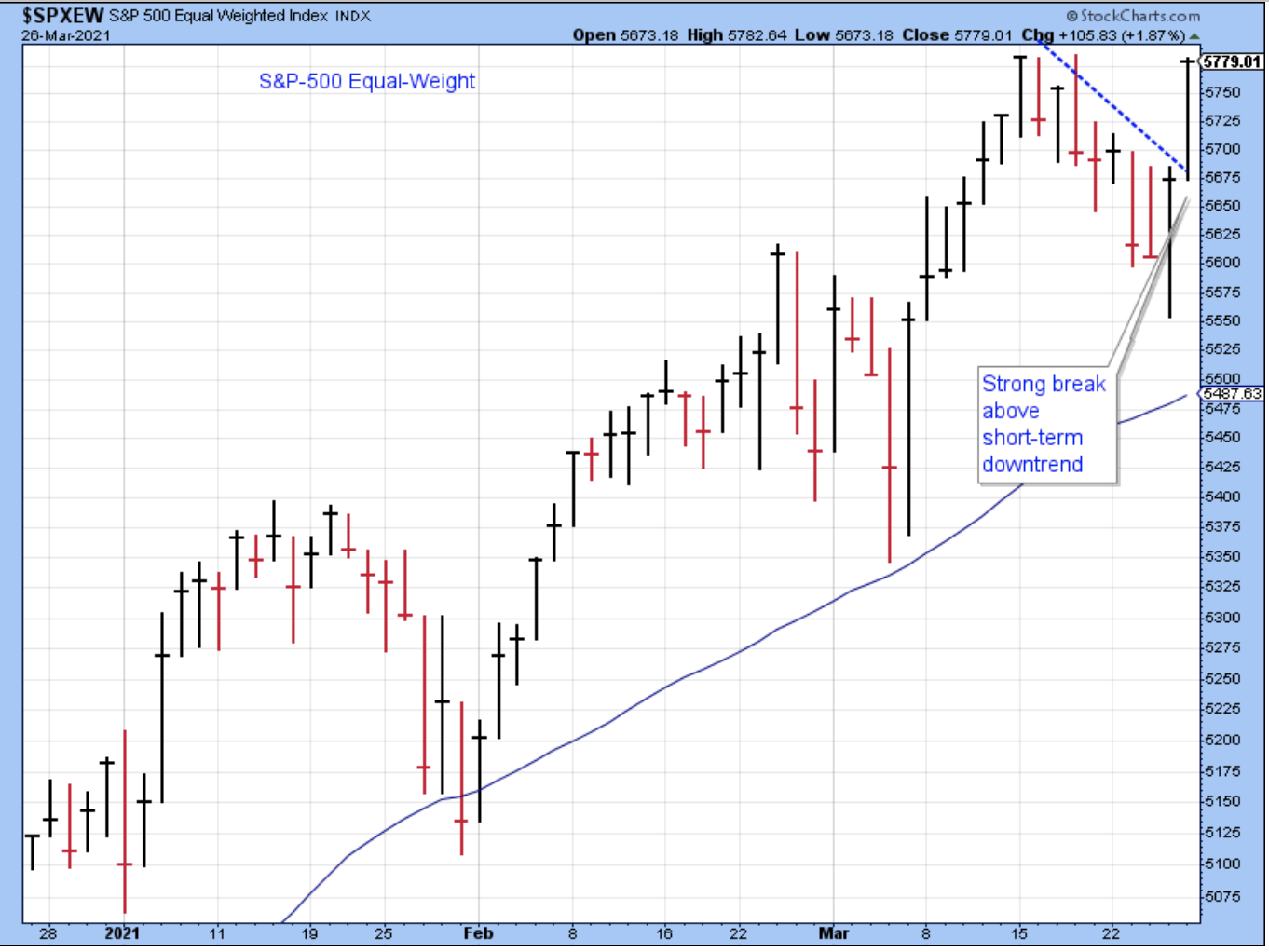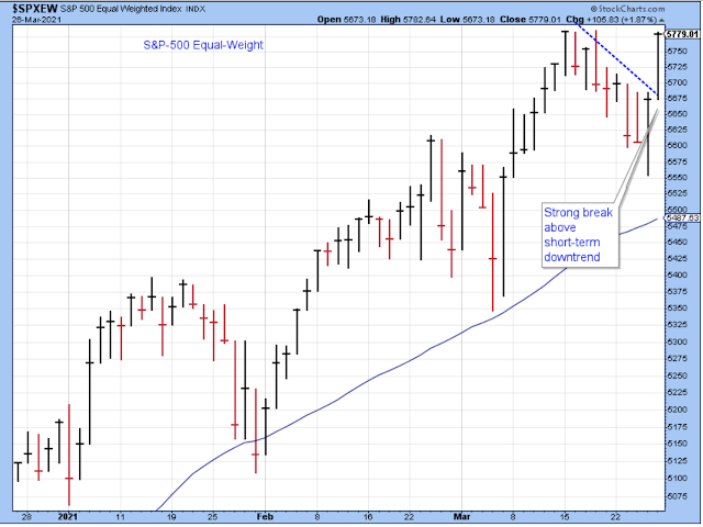 The SPX equal-weight had a convincing break out above the downtrend. It would be difficult to claim that the market is trending lower with a chart like this one, but we've all seen breakouts like this fail at times, so I'm prepared for the possibility.