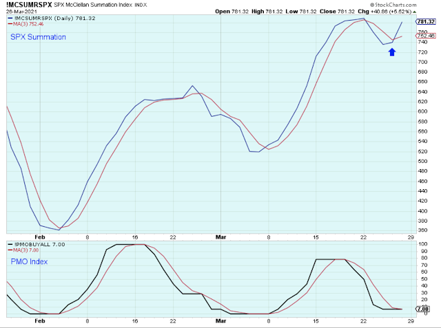 The SPX summation has turned higher nicely, but it would be more convincing if it had turned higher from a much lower level.