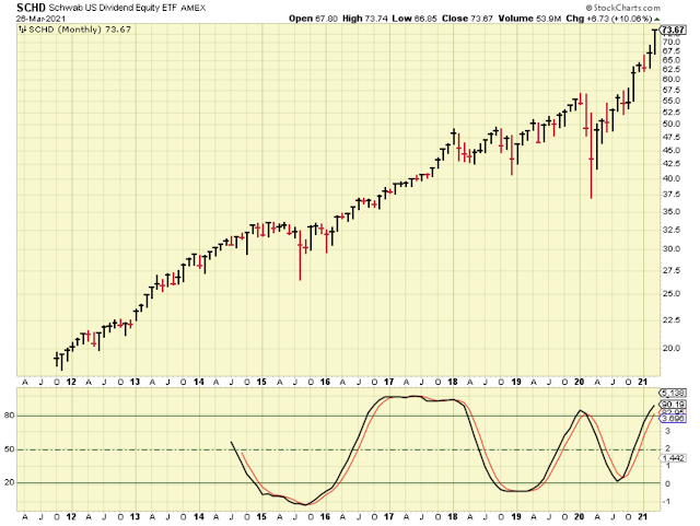 Over the last few years, my favorite spot for the longer-term has been this ETF shown below, but it looks so extended now. Unfortunately, I think the answer is that we need another significant correction before committing the cash longer-term. For now, I'm more focused on the long-term sell signals for this ETF than I am on the long-term buy signals