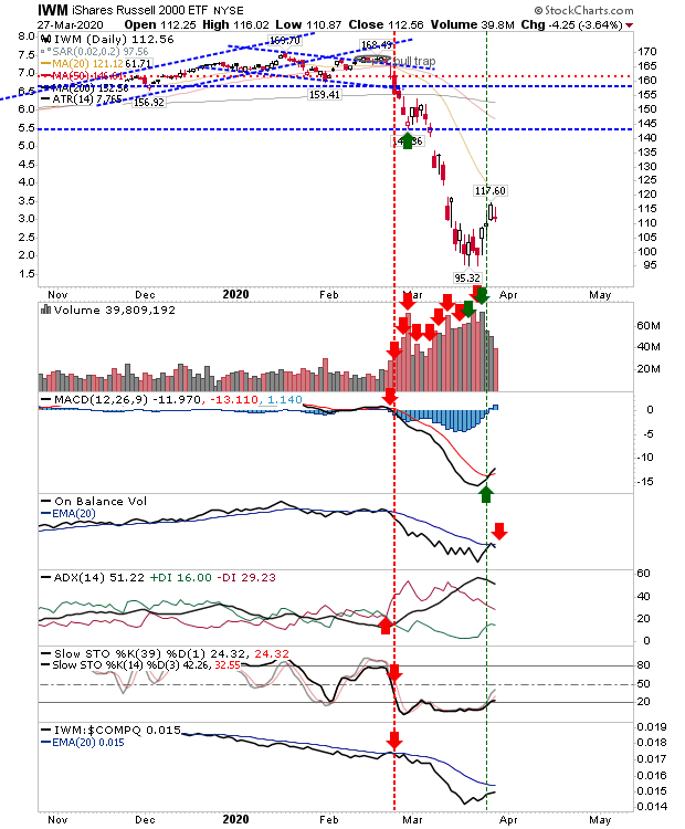 For the S&P, this convergence of bearishness has also come with a bearish cross in 'On-Balance-Volume', but still has the MACD trigger 'buy'.The question is whether this will in fact be a swing high reversal, or will the index continue higher - looking at the 50-day MA as the next supply, reversal zone.