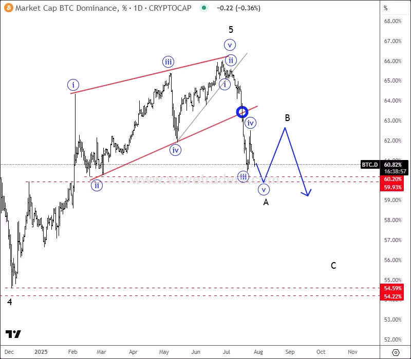 Regarding dominance, Bitcoin Dominance(BTC.D) keeps falling within wave A as expected and it can be now trading in subwave »v« of A down to 60%-59%.