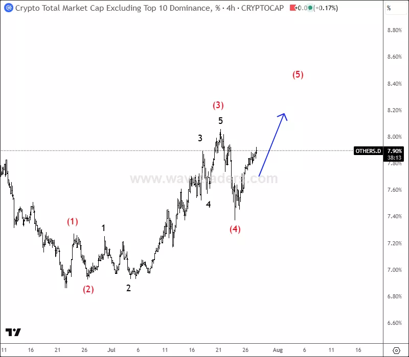 As a result, ALTcoin dominance(OTHERS.D) is waking up in an impulsive fashion, and it can be trading in wave (5). So ALTcoins are currently stronger and they can extend even higher this week, as Crypto TOTAL market cap chart is attacking 4T area.