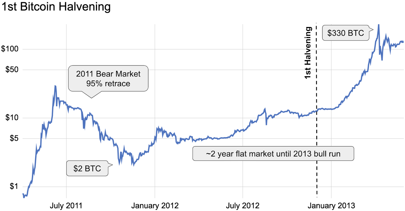 As illustrated in the graph below, Bitcoin’s 1st halving occurred in early 2012, when the Bitcoin ecosystem was small, fragile, and volatile. See source here.