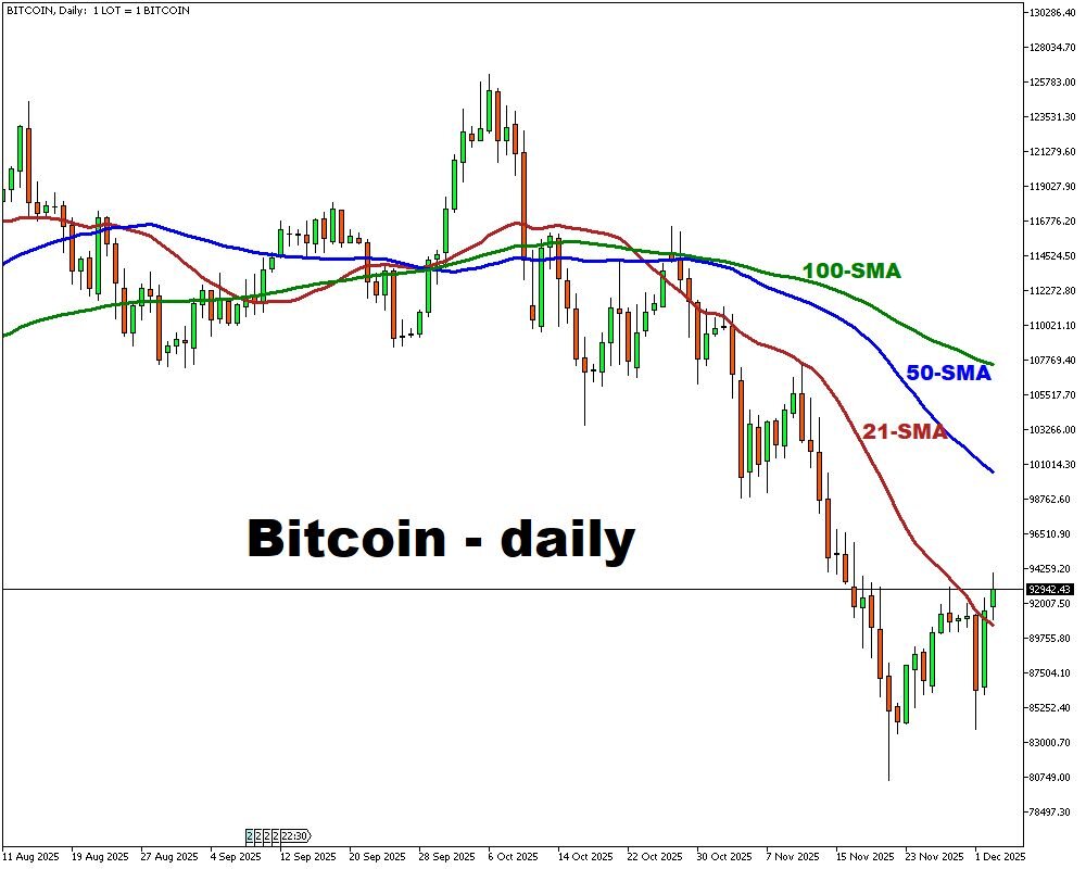 Bitcoin climbed about 2% on Wednesday to a two-week high near $93,900, a modest rebound after weeks of steep losses.