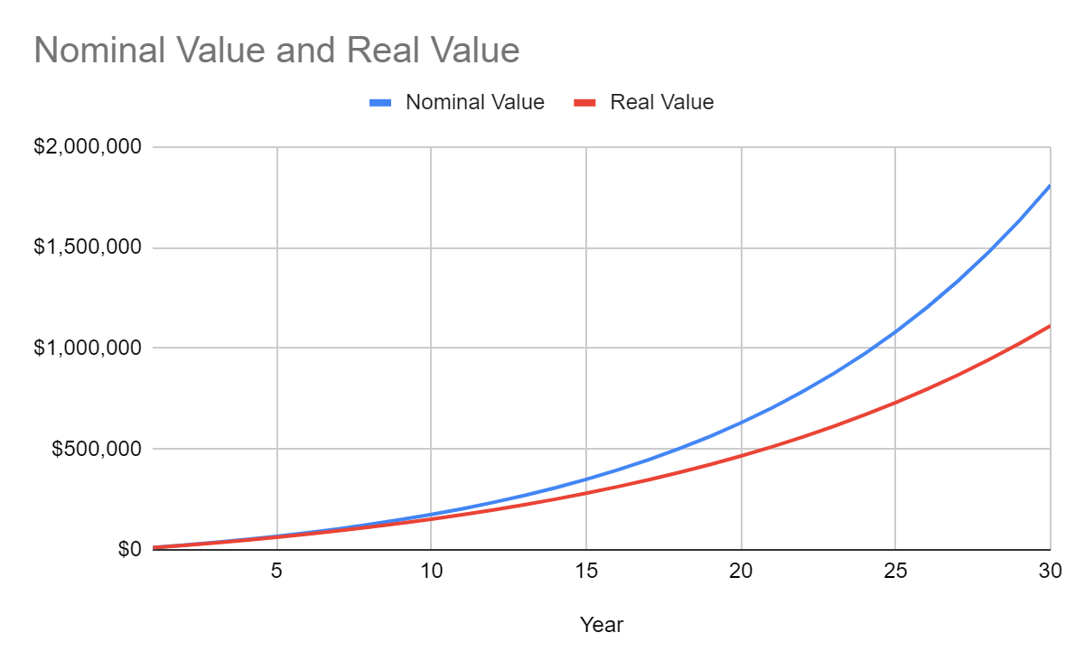 Below shows the “nominal value”, which is the actual dollar amount, and the “real value”, which is the amount adjusted for inflation. You have $1.8 million, but your expenses have also increased drastically!