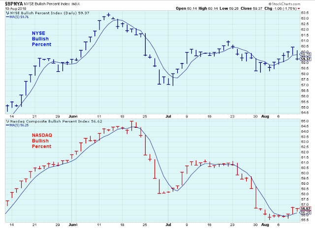 This chart below shows how the NYSE stocks remained reasonably healthy over the last few months while the NASDAQ stocks were weakening. Then again, with the SPX pushing to new highs, this chart of the bullish percents shows that the broad market is not participating.