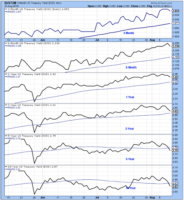 Short-term yields are still pointed higher, but longer-term yields are once again pointing lower.