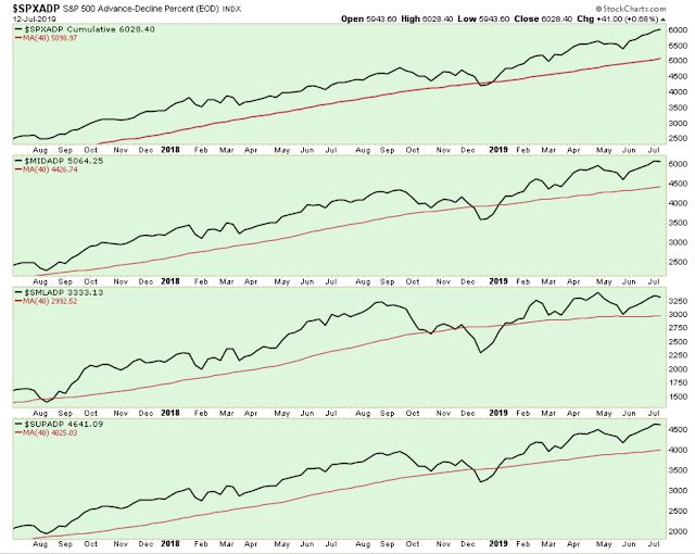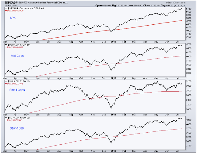 A chart published this morning by Arthur Hill.Lot's of strength showing here except maybe the small caps which are below the May highs. Arthur doesn't like the advance/decline lines of the major indexes because they include so many marginal stocks and special investment vehicles.