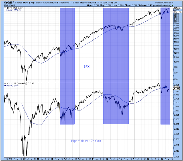 Here is a chart that shows that stocks do better when the high yield ETF is outperforming the 10 year Treasury ETF.Like I said, I am always looking for the worm in the apple.