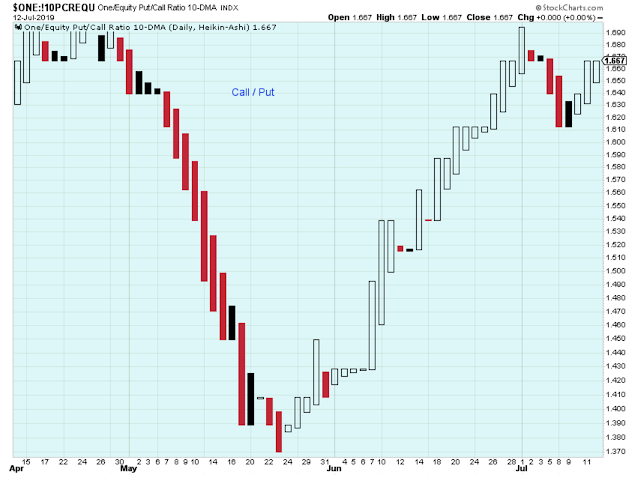 Last week I thought that the Call/Put ratio was starting to signal that the next short-term downtrend was starting, but it turned back up this week along with the market. Still, this choppy behavior is probably a sign that the market is a bit wobbly.